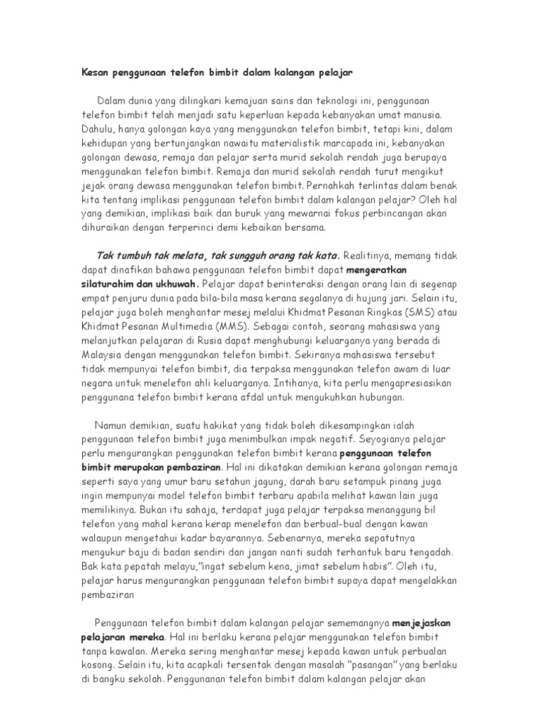Patuhi larangan telefon bimbit di tempat awam. Karangan Kebaikan Telefon Pintar Kepada Pelajar. Kesan buruk yang akan diperoleh pelajar jika menyalahgunakan telefon bimbit adalah mereka berisiko untuk terdedah kepada pengaruh atau anasir yang tidak sihat.